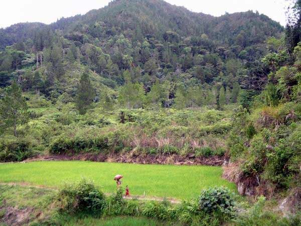- Sebagian longsoran yang masih dapat dibersihkan ditanami padi. Latar belakang adalah Bukit Tampean yang lerengnya longsor.