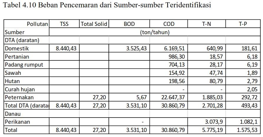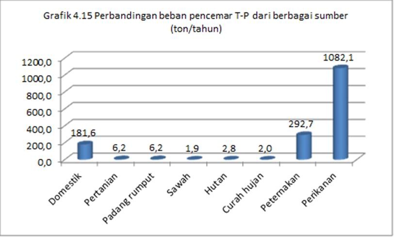 Saat ini jumlah beban pencemar phosphor dari sumber teridentifikasi mencapai 1.575,53 ton pertahun, 1.082,1 ton diantaranya berasal dari kegiatan budidaya perikanan sedangkan sisanya 493,43 ton berasal dari DTA dan curah hujan.