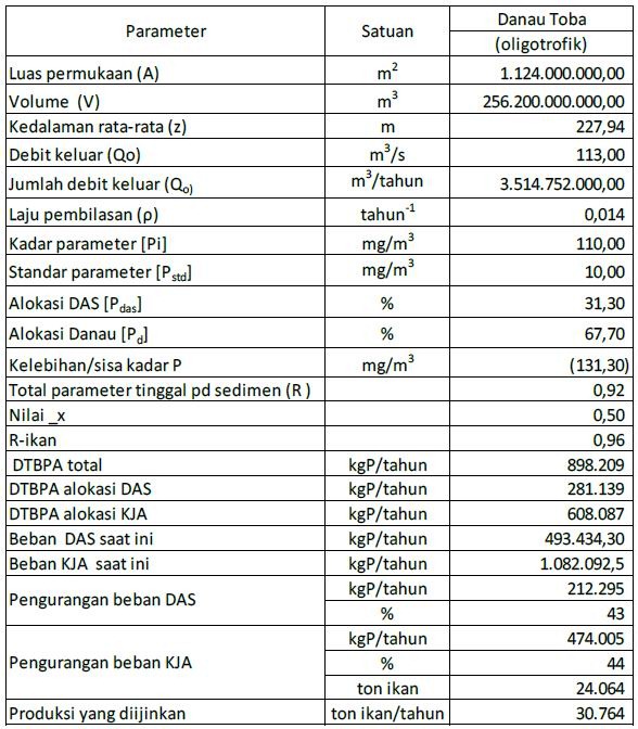 Berdasarkan perhitungan beban pencemar dari sumber-sumber teridentifikasi, diketahui bahwa sektor budidaya perikanan menyumbangkan pencemar T-P sebesar 68,7% sedangkan sektor lainnya hanya 31,3%. Dengan kondisi ini, maka danau Toba tidak memiliki daya dukung lagi terhadap budidaya perikanan.