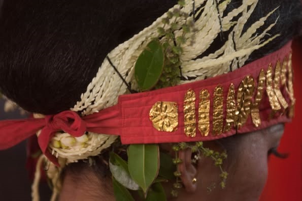 Pengantin wanita dengan riasan rambut; mangemange, banebane, napuran, bunga rondang dan beringin.